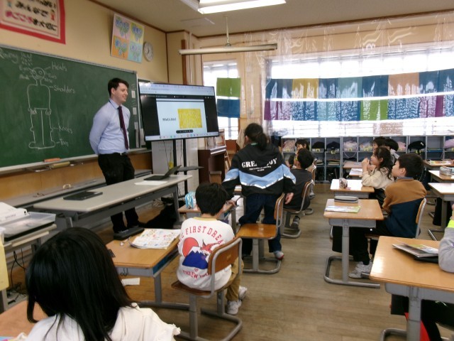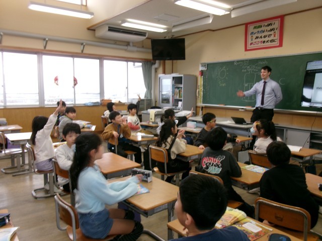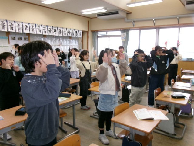 今日の外国語の学習では、体の部分の名前が出てくる曲に合わせて、その部分をさわりながら歌う活動をしました。