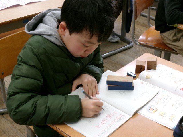 立体の仲間分けをしました。その後、その結果をノートにまとめる時間を設けました。丁寧に書こうとする姿が見られました。