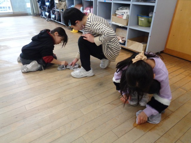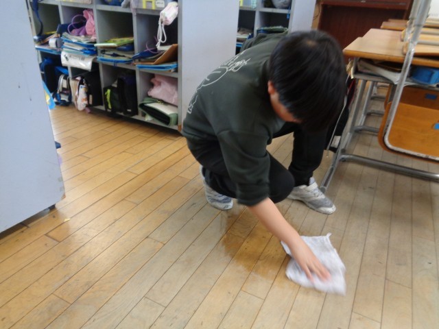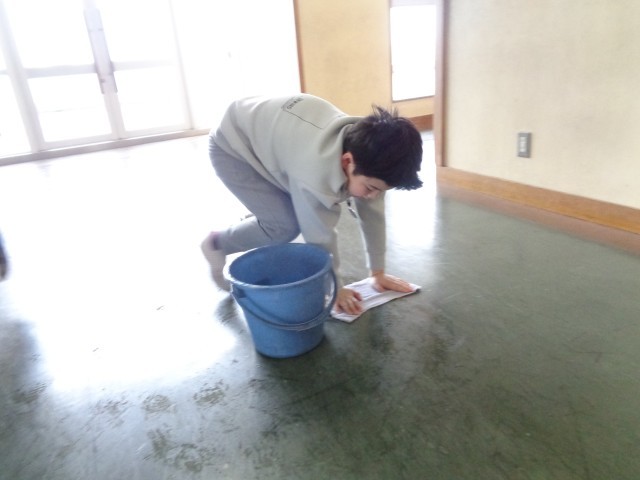 学年末の大掃除週間が始まりました。今日の重点項目は「床の汚れとり」ということで、水拭きをしたり、汚れている部分を念入りに磨いたりしました。きれいになると気持ちがよいですね。