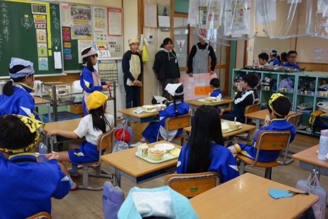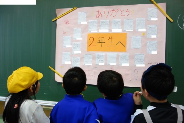 先日の卒業を祝う会のお礼に、6年生がメッセージを届けにきてくれました。メッセージを嬉しそうに読んでいる2年生の子供たちでした。