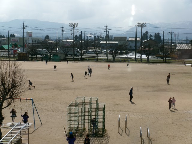 業間の様子です。雪が溶け、晴れた今日は、たくさんの宮野っ子が外で遊んでいました。