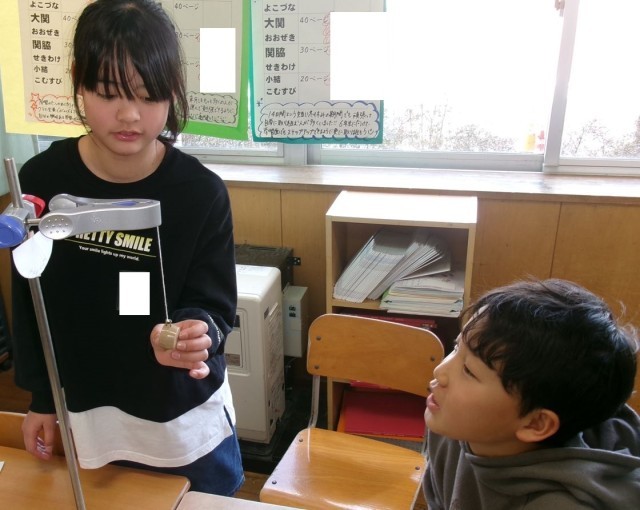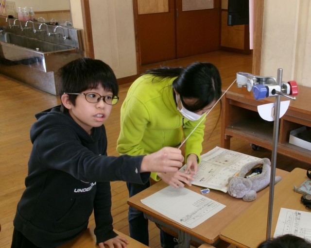 今日の理科では、ふりこの実験を行いました。1往復にかかる時間はどの条件を変えると変わるかを試し、「ふりこの長さが変わると1往復にかかる時間が変わる」と発見していました。