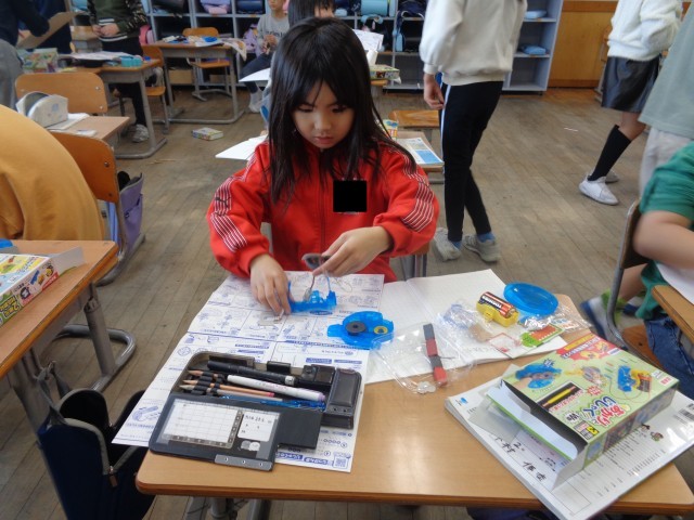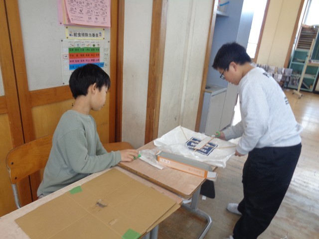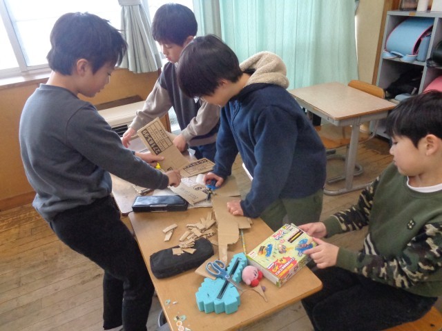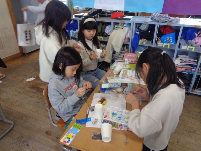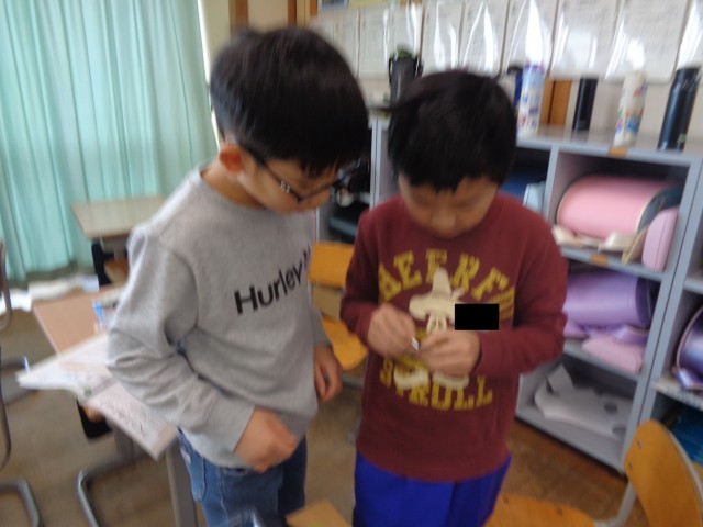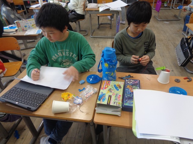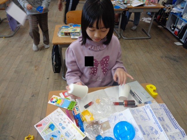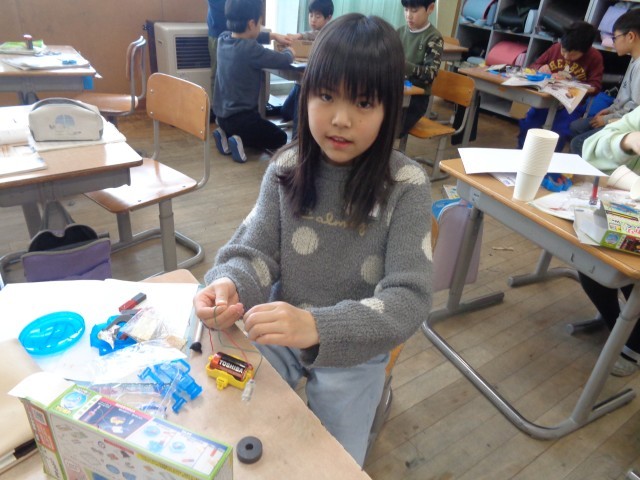 音の学習を生かして糸電話を作った子や風の学習を生かして凧を作った子、磁石の学習を生かしてクレーンゲームを作った子など、様々なおもちゃができていてました。