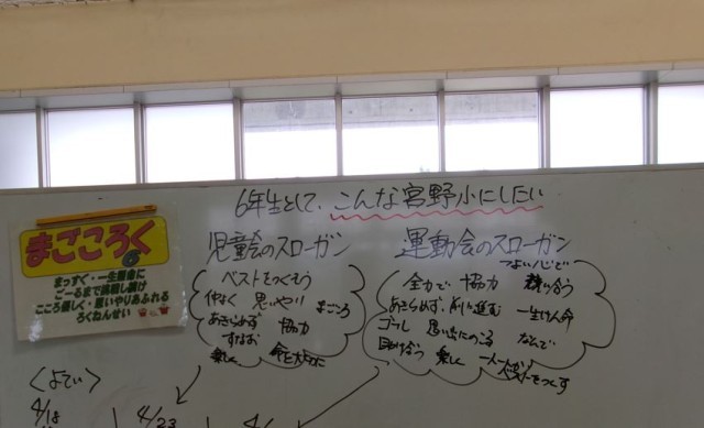 今日の1限目には学年集会を行い、みんなで「こんな宮野小学校にしたい」を話し合いました。ここで話し合ったことをもとに、児童会スローガンを決めていきます。