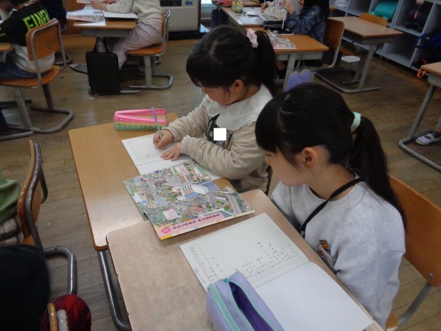 最初の授業では、教科書にある町の写真を見ながら、どんな建物があるか話し合いました。