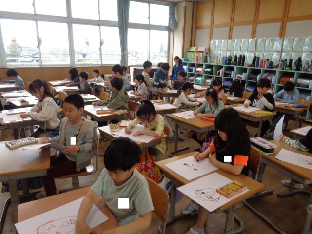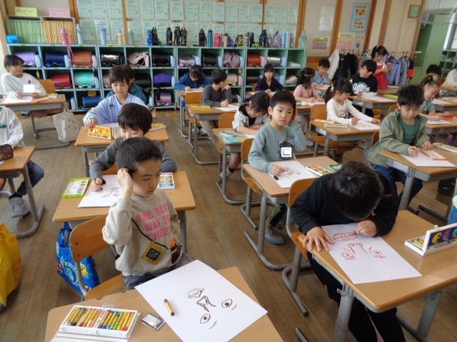 図工の時間に自分の顔を触って、イメージを描きました。まず、中心に大きな鼻。そして、顔中を触りまくって目や口、耳などを書き加えていきました。仕上がりが楽しみです。