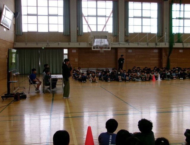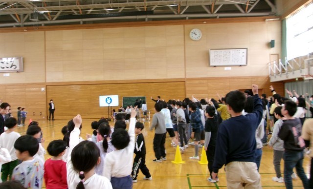 今日、体育館に全校児童が集まり、第一回児童総会が行われました。