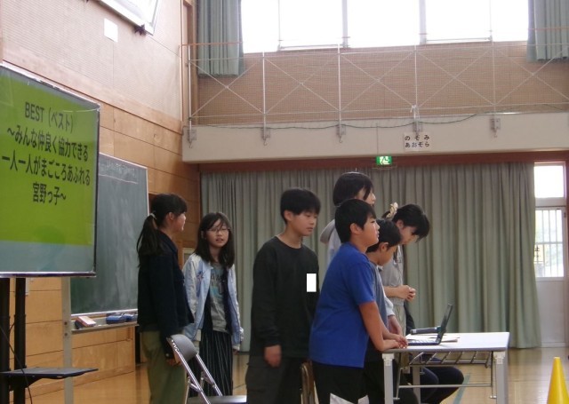 児童総会では、児童会スローガンの発表や「宮野小学校をよりよくするためには?」という議題でききあいタイムも行われました。各クラスで話し合ったことを発表したり聞き合ったりすることができました。