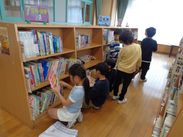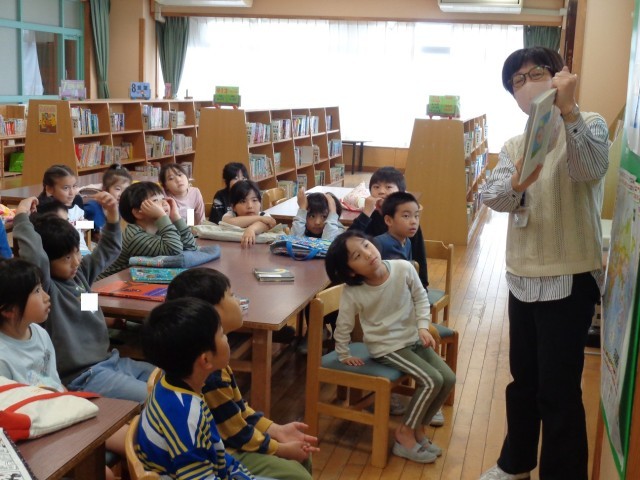 子供たちは、毎週定期的に図書室に通い、図書を借りています。本日は、学校司書の先生から、すてきな読み聞かせをしていただきました。