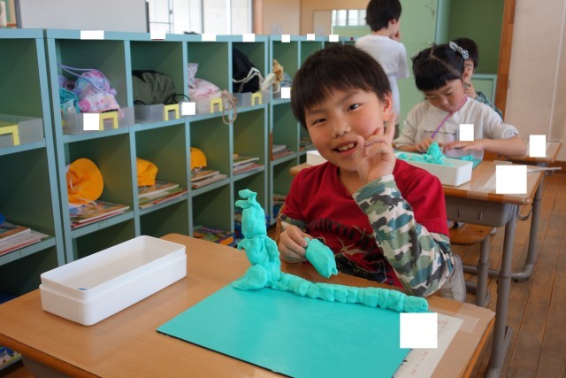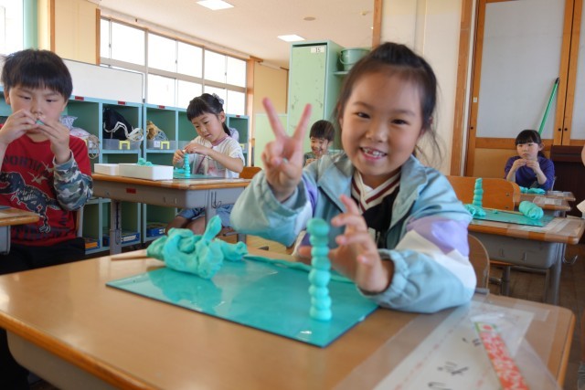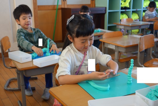 押しつぶしたり、丸めたり、積み上げたり、…。生き生きと学習する子供たちでした。