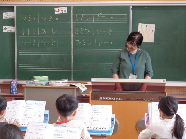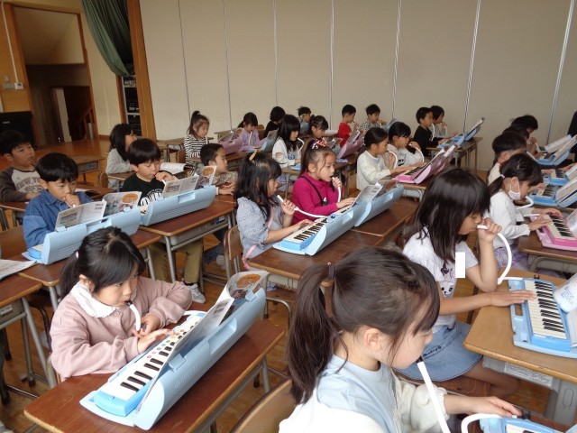 音楽の時間では、子供たちが楽しみにしている鍵盤ハーモニカを使って「かっこう」を演奏しました。はじめは、指使いを意識してゆっくり演奏。何度も何度も練習し、こつをつかんでいた2年生です。
