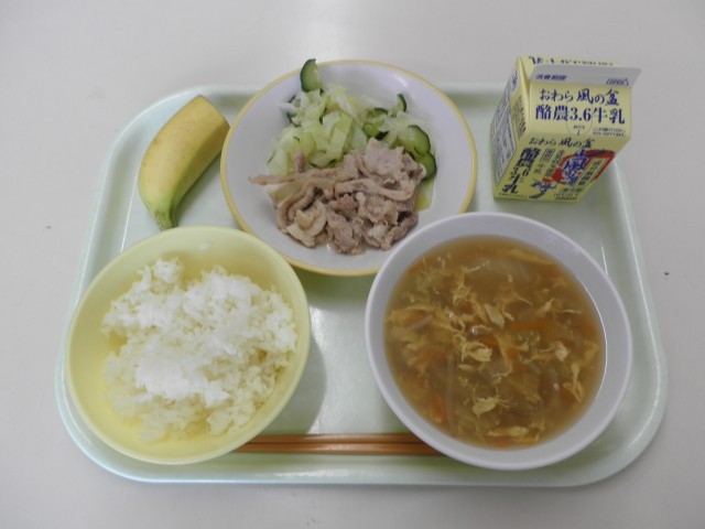 献立名:ごはん 牛乳 豚肉の塩こうじ炒め きざみ和え 中華かきたま汁 バナナ