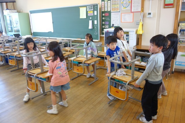 掃除の時間の様子です。床を傷つけないよう、力を合わせて机を持ち上げています。1年生には重い机ですが、がんばって掃除に取り組んでいます。