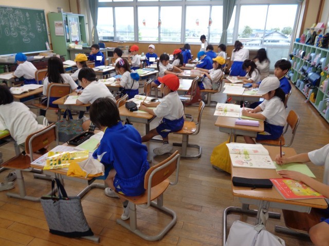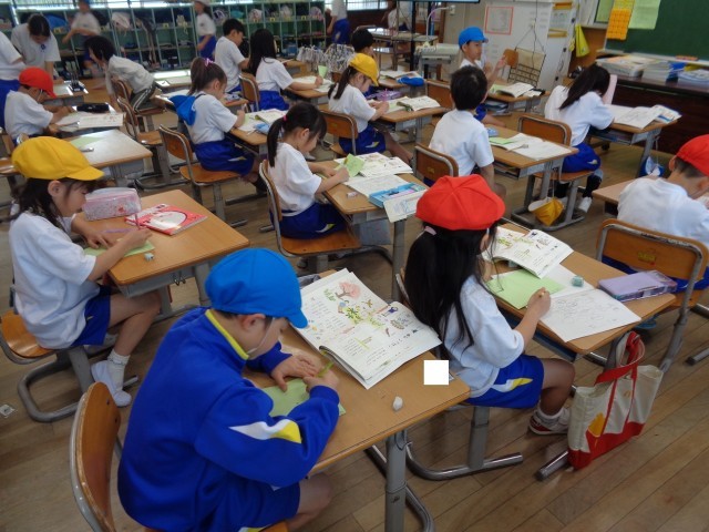 「春がいっぱい」の学習で、春をイメージするものをノートに書き出しています。「春といえば、桜、お花見、レンゲ、モンシロチョウ、ウグイス、三色団子・・・・・」と、いう具合に次々に連想をしていきます。そして、最後に子供たちのお気に入りの春を描きました。