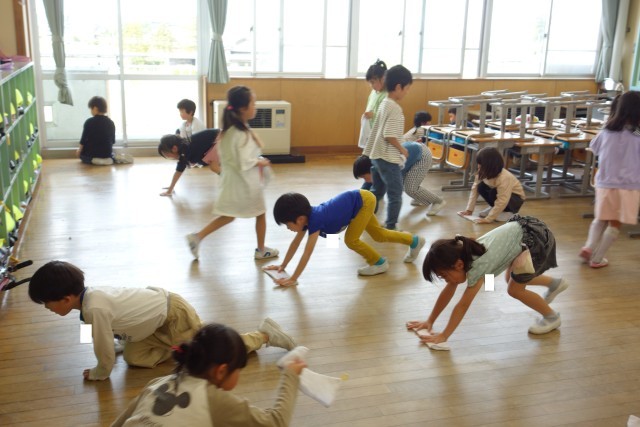 掃除の仕方にも少しずつ慣れてきた子供たち。みんなで協力して、教室をピカピカにしています。