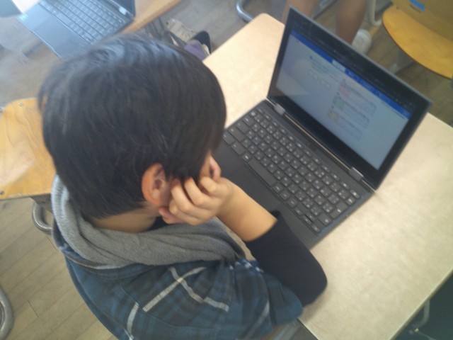 比例の学習を終え、今日の内容が分かったのかどうかを確認するためにクロームブックでドリルに取り組みました。運動会の予行後でしたが、集中して取り組むことができていました。