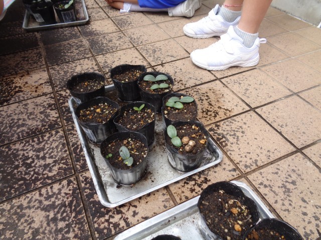 たねをまいたヘチマの芽が出ました。そして、子葉(しよう)が2枚出ました。