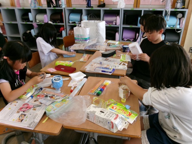まず、生活に使うことをイメージして、空き容器を切ったり、組み合わせたりして形をつくりました。