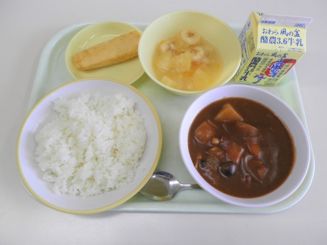 献立名:ごはん 牛乳 食べキリンハヤシ 卵ロール フルーツミックス