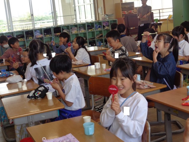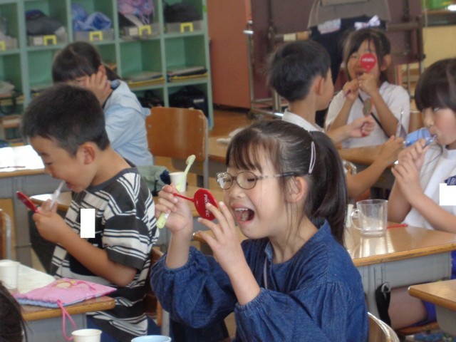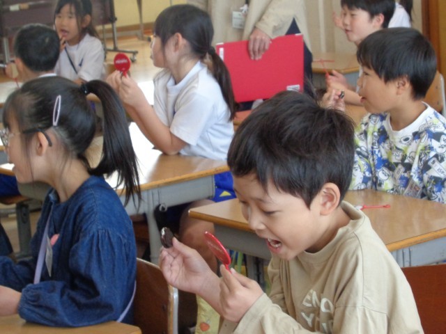 1組で教育実習生が、「歯の王様」(6歳臼歯)をぴかぴかにする授業を行いました。子供たちは、歯の大切さを学び、ていねいに歯磨きをしていました。