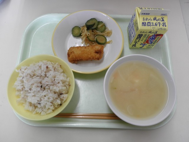 献立名:雑穀入りごはん 牛乳 いかフライ 華風和え すいとん