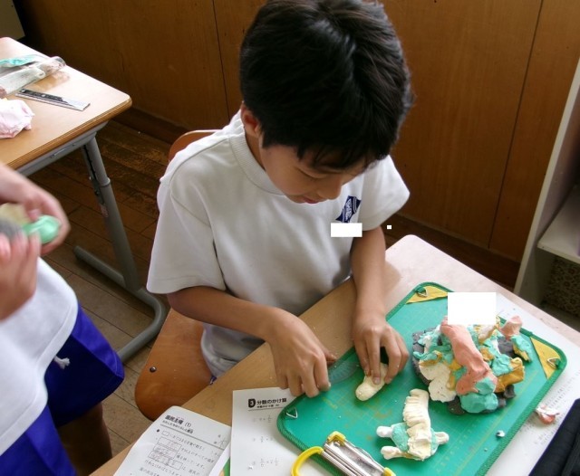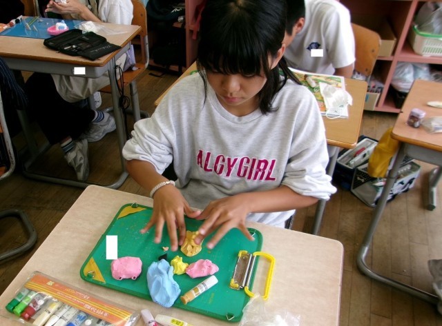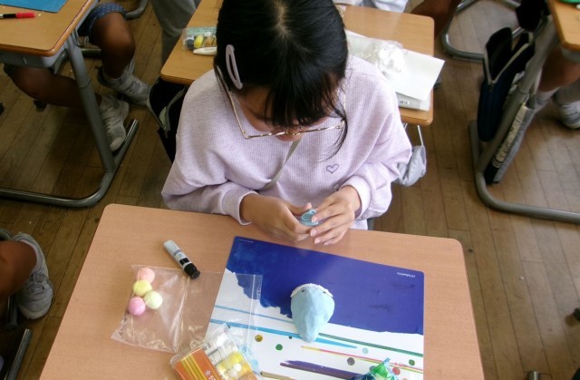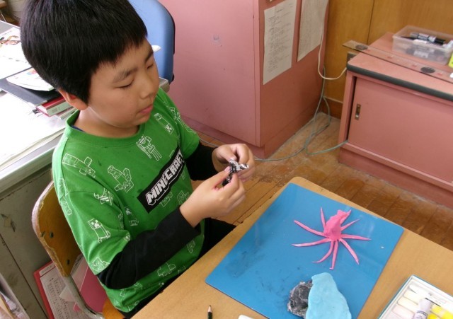6年生の図工では、粘土板を水面に見立て、水の上の世界を粘土で表現しています。