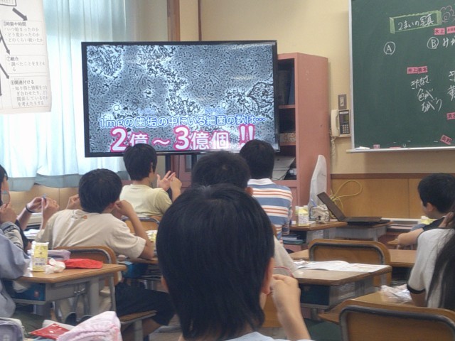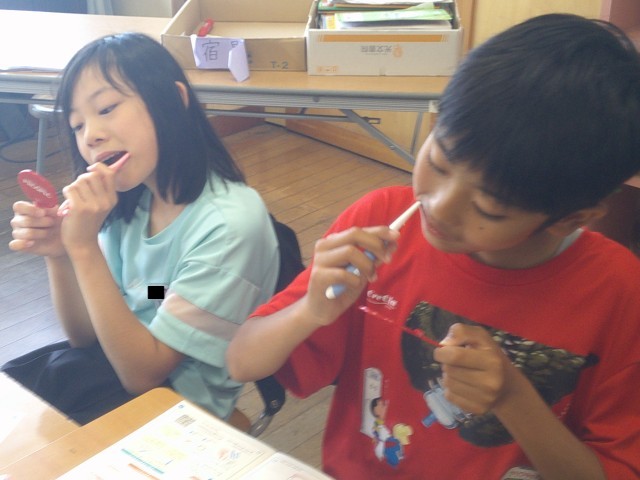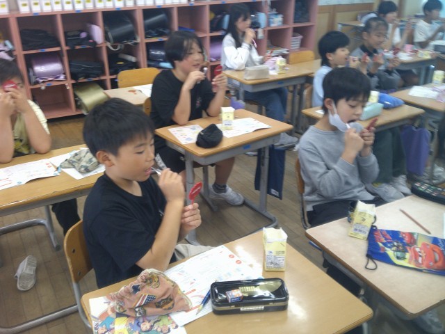 歯肉炎の原因や予防のためのブラッシング、デンタルフロスの使い方について学びました。歯垢の中にいる菌の映像には多くの子が驚いていました。学んだことを早速給食後に実践していました。
