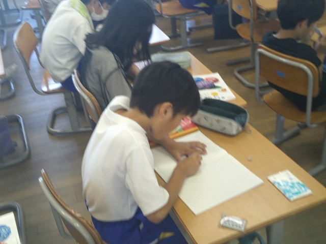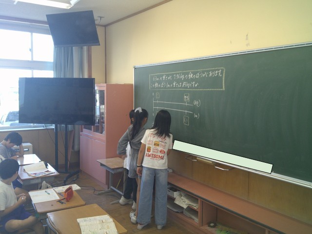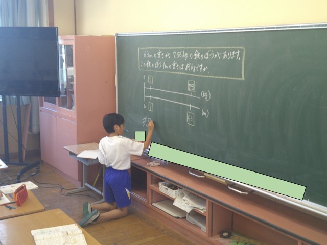 問題文を数直線に表し、小数のわり算の計算について考えています。進んでノートや黒板に自分の考えを書いてくれています。
