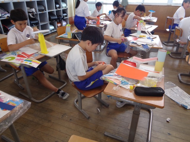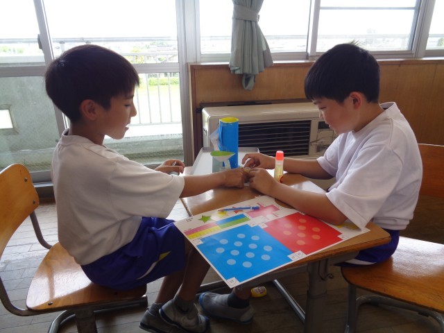ビー玉を転がして楽しく遊ぶものをつくっています。ビー玉を転がすコースや表したい形を考え、くふうしながら取り組んでいます。