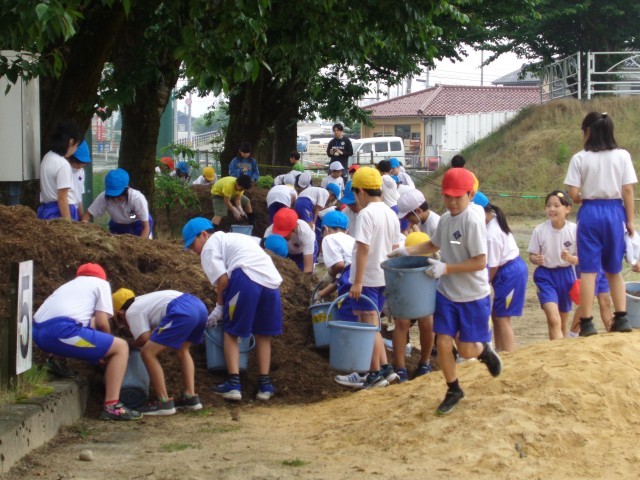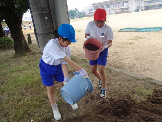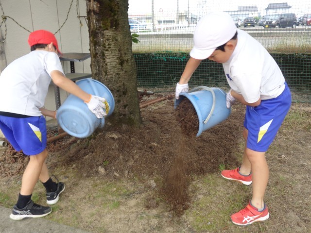 4年生の学習のテーマである「環境保全」の取り組みとして、伐採された枝葉の有効活用を考えました。ウッドチップ(木質チップ)を再利用して、桜並木の下に敷き詰めて、「防除効果」を継続して観察していきます。今後も天候をみて活動を進めていきます。