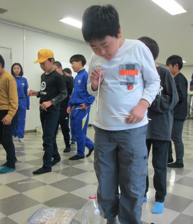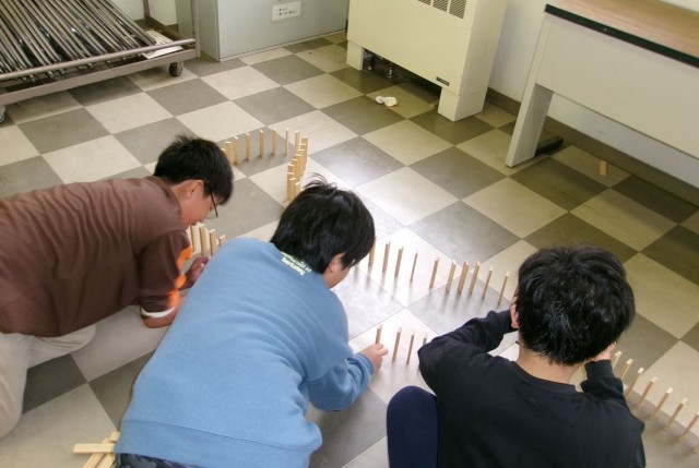 ドミノ倒しを行ったり、割り箸ダーツを行ったりして、班で競い合いました。