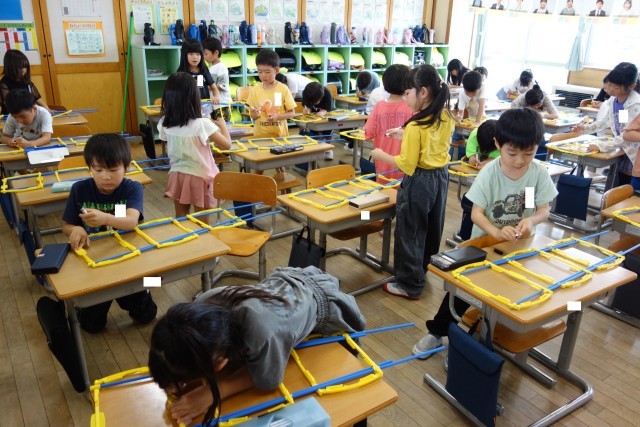 生活科の学習の様子です。「あさがおの葉っぱがぎゅうぎゅう詰めになって、苦しそう」「大きくなりすぎて、倒れてきている」「2年生が使っているる棒みたいなのをつかえばいい」子供たちなりの見方で、あさがおのお世話についてよく考え、実践中です。