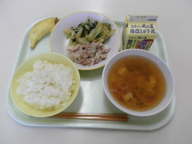 献立名:ごはん 牛乳 豚肉の塩こうじ炒め おひたし すまし汁 バナナ