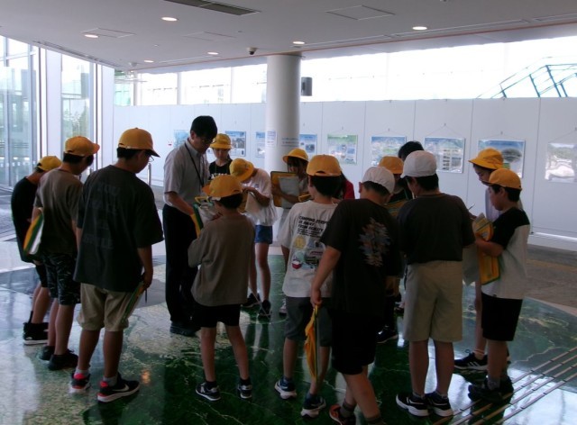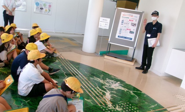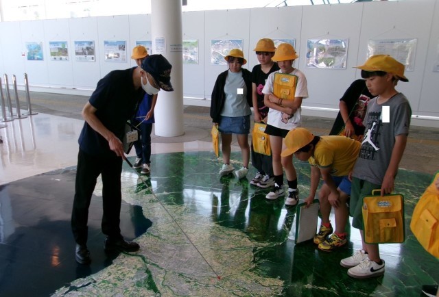 写真は、資料館の床にある地図で、なぜ宮野地区でイタイイタイ病が起きたのかを教えてもらっている様子です。