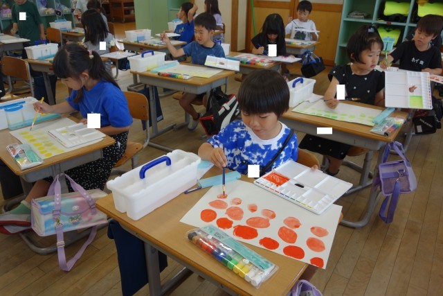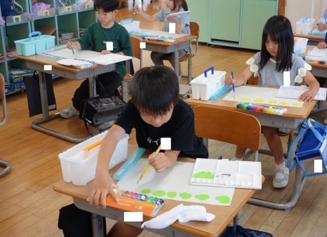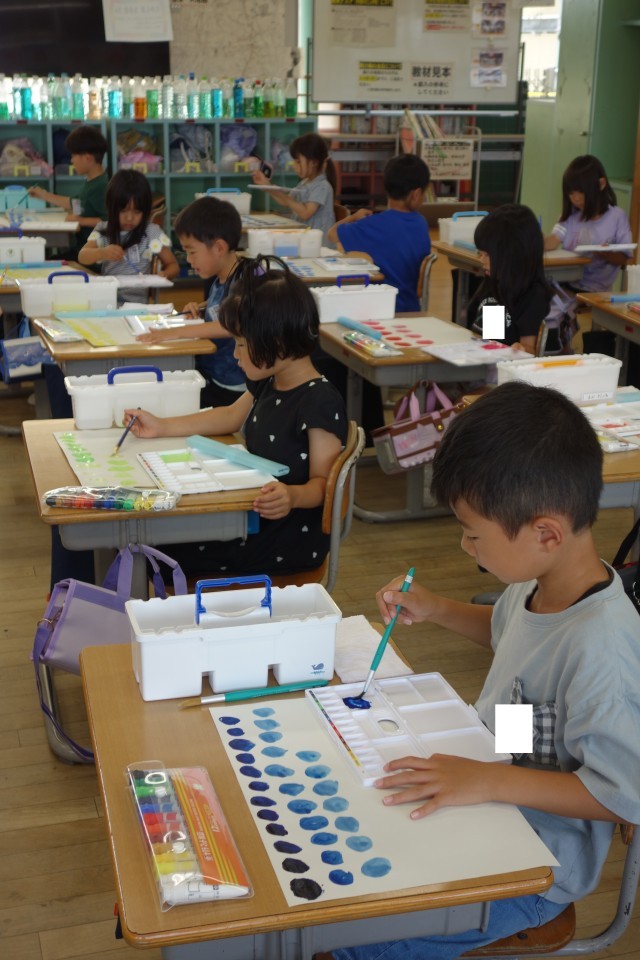 図画工作科の学習の様子です。水彩セットを使った学習の初回です。道具の名前・使い方を覚え、水彩を楽しみました。