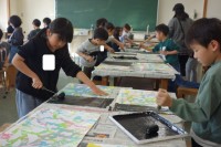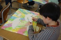 図画工作科の学習(ステンシルローラー版画)の様子です。2度目のローラーでの着色...