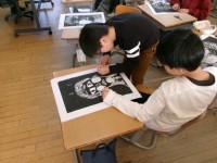 今日の図工の時間では、彫刻刀で彫った自分の作品にインクを付けて版画を行いました。...