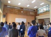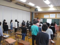 立山からの朝日が輝く中、6年生は朝の時間に歌を歌っています。きれいな歌声を響かせ...