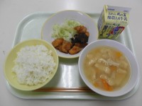 献立名:ごはん 牛乳 ホキの竜田揚げ チンゲンサイひたし 厚揚げのそぼろ煮 大豆...