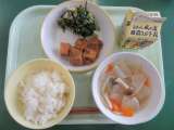 メニューは、ご飯、厚揚げの肉味噌がけ、磯和え、味噌汁、牛乳です。 のりは、昔...