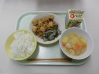 献立名:ごはん 牛乳 大豆のみそからめ ゆかり和え かぶと肉団子のポトフ大豆のみそからめは、ゆでた大豆と水で戻した高野豆腐に米粉をつけて油で揚げた後、砂糖やみそ、白ごま等のたれをからめた献立です。豆が...