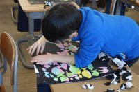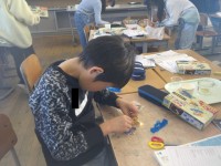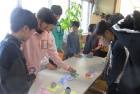 部分によって色を分けるために電動糸のこぎりで板を切り、ローラーで色付けを行いました。難しい作業は仲間と協力して取り組むことができています。