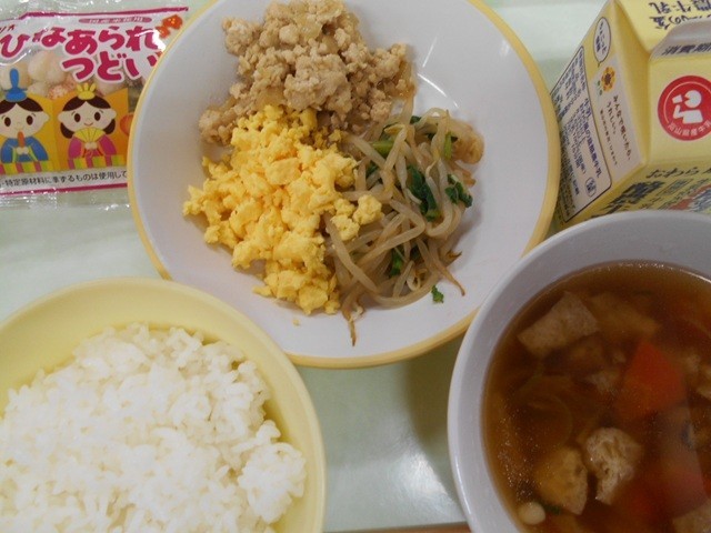 今日は「ひなまつり献立」です。【今日の献立】ごはん  牛乳  二色丼(鶏そぼろ)...