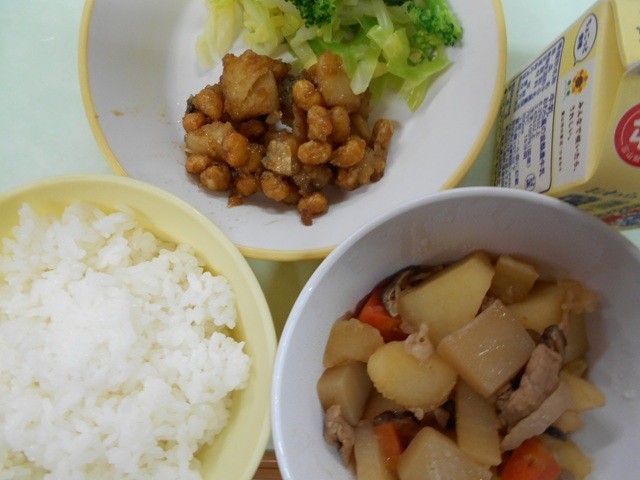 【今日の献立】ごはん  牛乳  たらと大豆の甘からめ  そえ野菜  大和煮