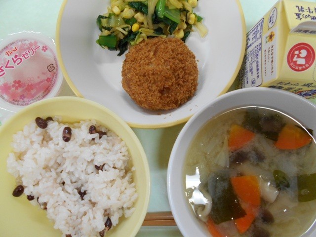 今日は、「卒業祝い献立」です。【今日の献立】赤飯  牛乳  とんかつ  コーン和...