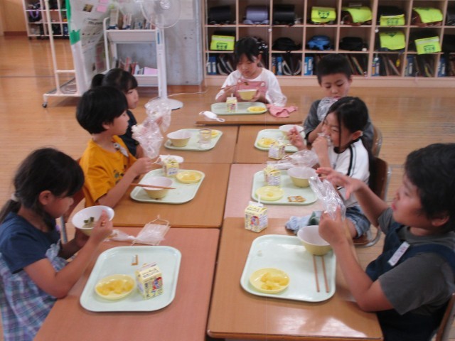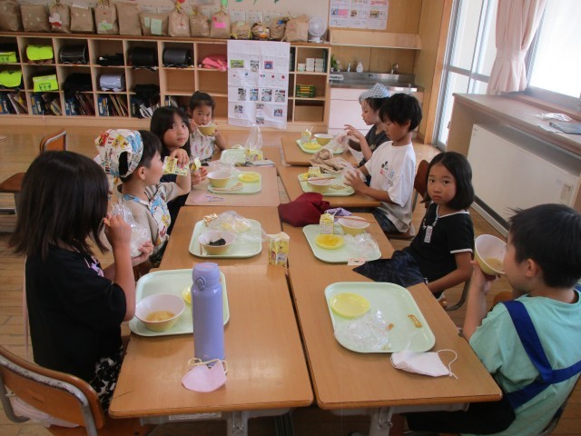 9月4日の献立は「防災献立」でした。袋にご飯とふりかけを入れておにぎりにして食べたり、長く保存ができる食材をふんだんに使ったおみそ汁を味わったりしました。防災について「食」という観点から考えることができました。