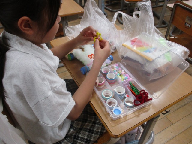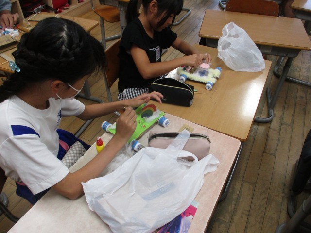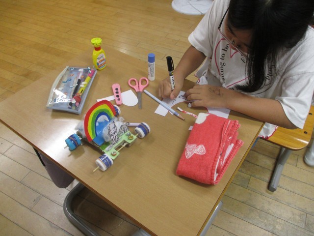2学期になって最初の図工作品が完成しました。子どもたちは家から持ってきたペットボトルキャップから手作りゴムカーを作り、その上に様々なものをのせた夢の乗り物を作りました。