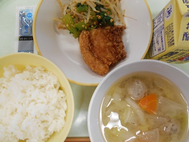 ごはん 牛乳 豚肉の香り揚げ いり大豆和え つみれ汁 のり佃煮