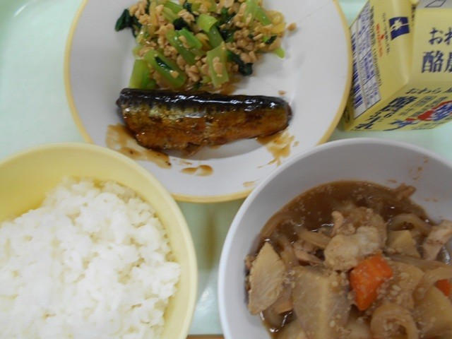 ごはん 牛乳 いわしの梅煮 納豆和え 鶏肉と里芋のごま煮