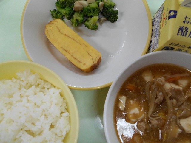 ごはん  牛乳  厚焼き卵  ブロッコリーとエリンギのソテー  豆腐の野菜あんかけ